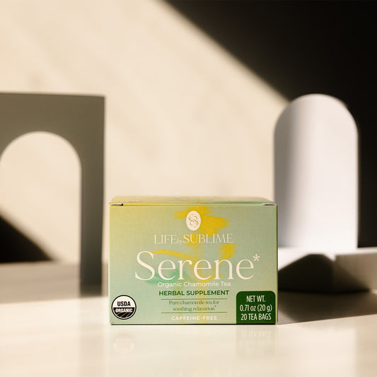 Serene offers the pure simplicity of organic chamomile in every cup. This caffeine-free blend is designed to calm your mind, soothe your senses, and support restful nights.